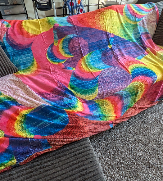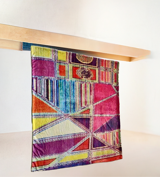 Our blankets are soft, double-layered fleece, 60x71, and carry the unbound, whimsical style of a digitally-meandering child. Each piece is a playful clash of colors and patterns, a cozy nod to the chaos and creativity of early digital graphics.