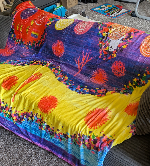 Hello, My Name is Anthony. When I made these I didn’t know how to read. My primary concern was going outside to play. My designs were made in 1991 on a Macintosh art program (Kid Pix). I was 5-6 years old. Back in those days they didn’t give kids tablets, they gave them large computers with floppy disks. I felt excited coming home to the computer to finish these and remember trying to sell them that summer like I was selling lemonade on the sidewalk, totally normal. The designs were then rediscovered twice, in 2018 and 2023, and will be made into more blankets, bags and other apparel.